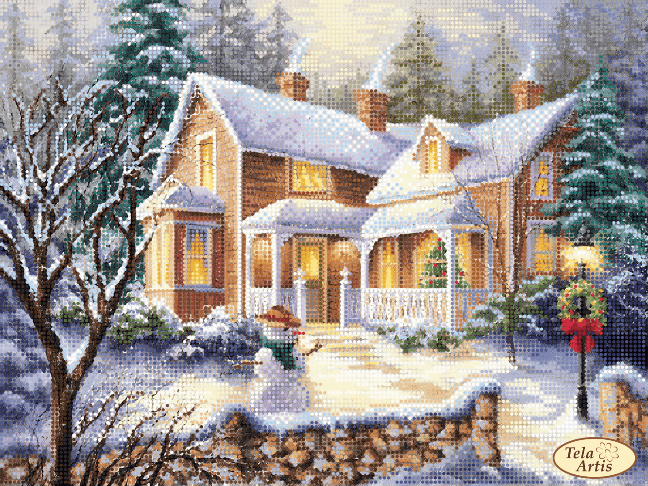 Схема для вышивки бисером Домик мечты. Атмосфера праздника выполнена на плотном атласе, продублированном флизелином. Края всех схем Тэла Артис запаяны и не сыпятся в процессе вышивания. На схеме указаны количество и рекомендуемые цвета бисера Preciosa.