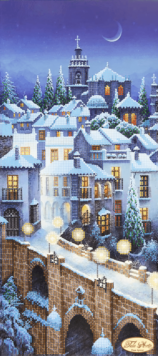 Схема для вышивания бисером Заснеженный город выполнена на плотном атласе, продублированном флизелином. Края всех схем Тэла Артис запаяны и не сыпятся в процессе вышивания. На схеме указаны количество и рекомендуемые цвета бисера Preciosa.