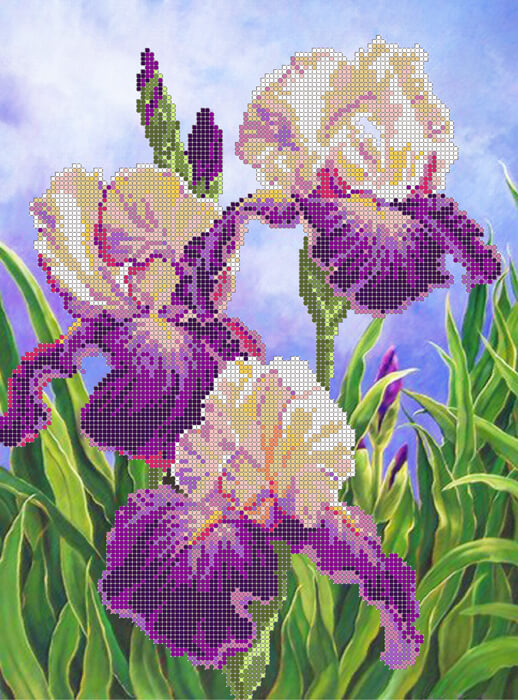 Схема для вышивки бисером Ирисы ТМ Картины Бисером выполнена на высококачественном габардине. Каждая схема комплектуется инструкцией и картой рекомендованных цветов с указанием количества и веса бисера.