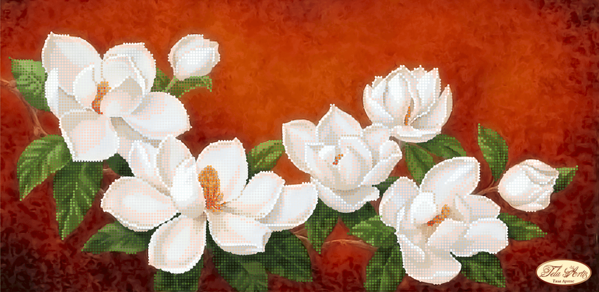 Схема для вышивания бисером Магнолия в цвету выполнена на плотном атласе, продублированном флизелином. Края всех схем Тэла Артис запаяны и не сыпятся в процессе вышивания. На схеме указаны количество и рекомендуемые цвета бисера Preciosa.