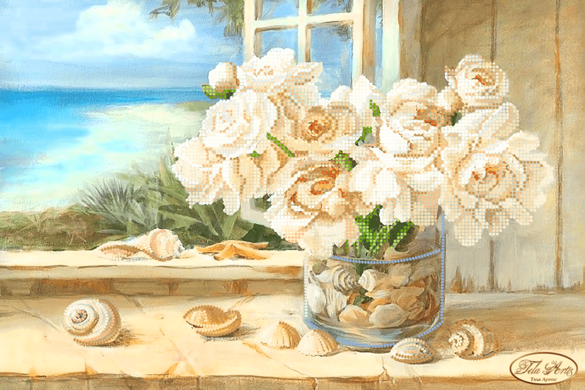 Схема для вышивания бисером Морской пейзаж выполнена на плотном атласе, продублированном флизелином. Края всех схем Тэла Артис запаяны и не сыпятся в процессе вышивания. На схеме указаны количество и рекомендуемые цвета бисера Preciosa.