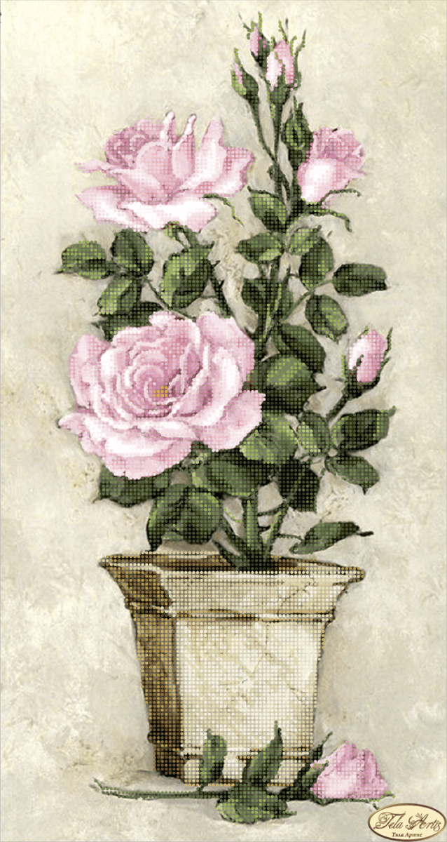 Схема для вышивания бисером Розовые розы выполнена на плотном атласе, продублированном флизелином. Края всех схем Тэла Артис запаяны и не сыпятся в процессе вышивания. На схеме указаны количество и рекомендуемые цвета бисера Preciosa.