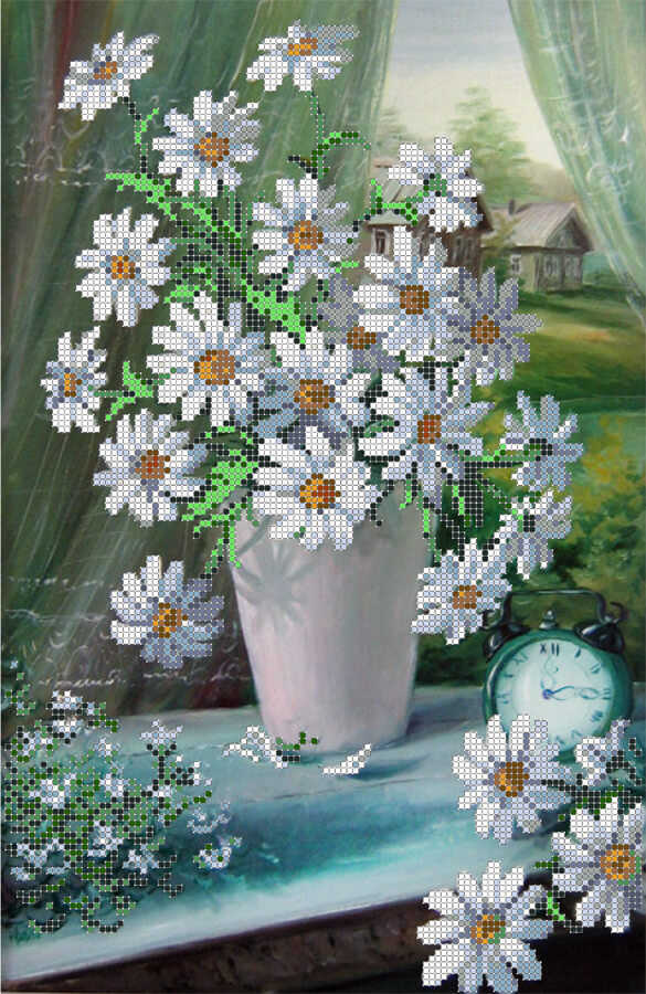 Схема для вышивки бисером Ромашки на окне ТМ Картины Бисером выполнена на высококачественном габардине. Каждая схема комплектуется инструкцией и картой рекомендованных цветов с указанием количества и веса бисера.
