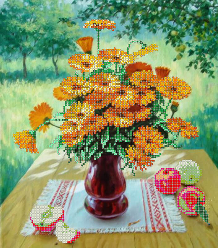 Схема для вышивки бисером Солнечный букет ТМ Картины Бисером выполнена на высококачественном габардине. Каждая схема комплектуется инструкцией и картой рекомендованных цветов с указанием количества и веса бисера.