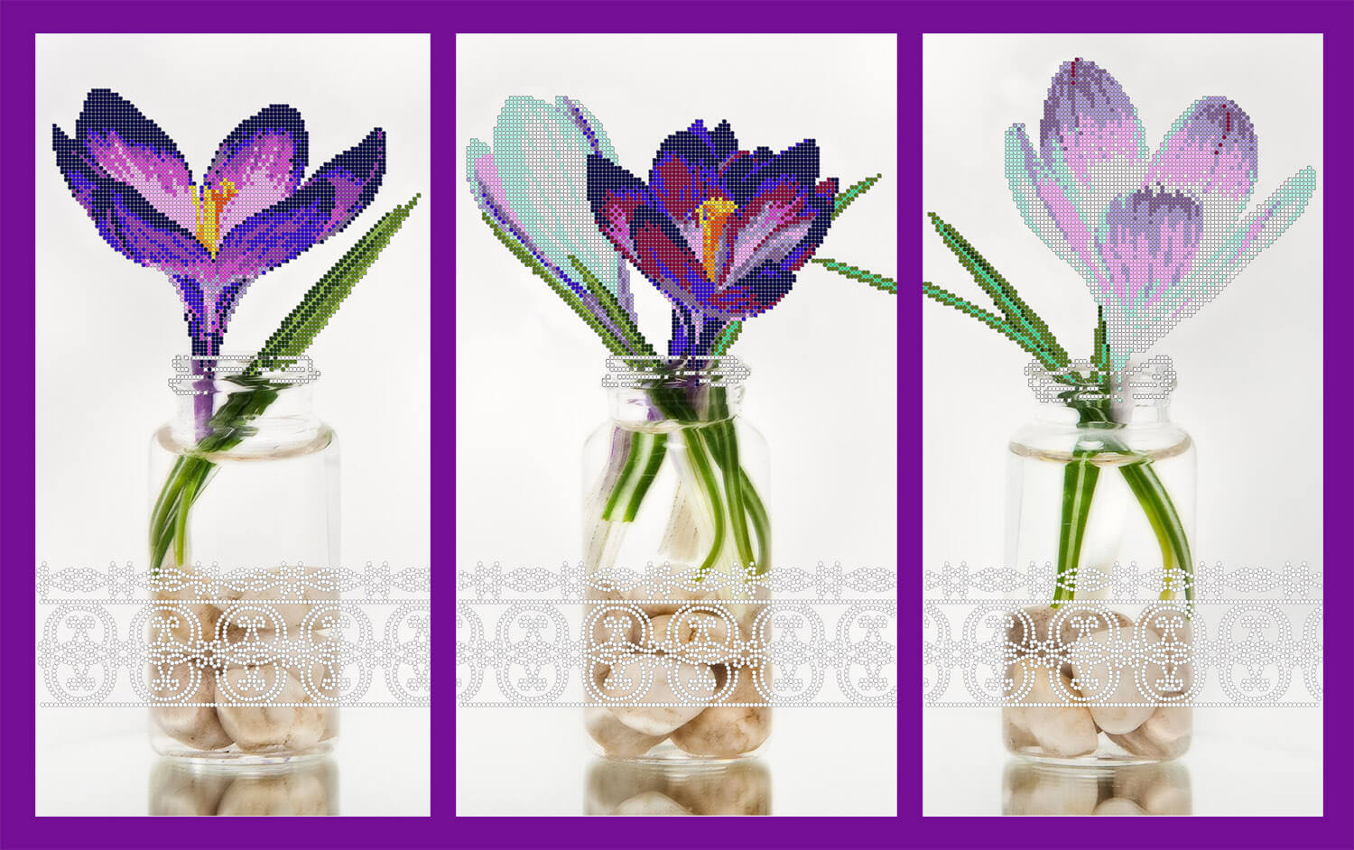 Схема для вышивки бисером Триптих Крокусы ТМ Картины Бисером выполнена на высококачественном габардине. Каждая схема комплектуется инструкцией и картой рекомендованных цветов с указанием количества и веса бисера.