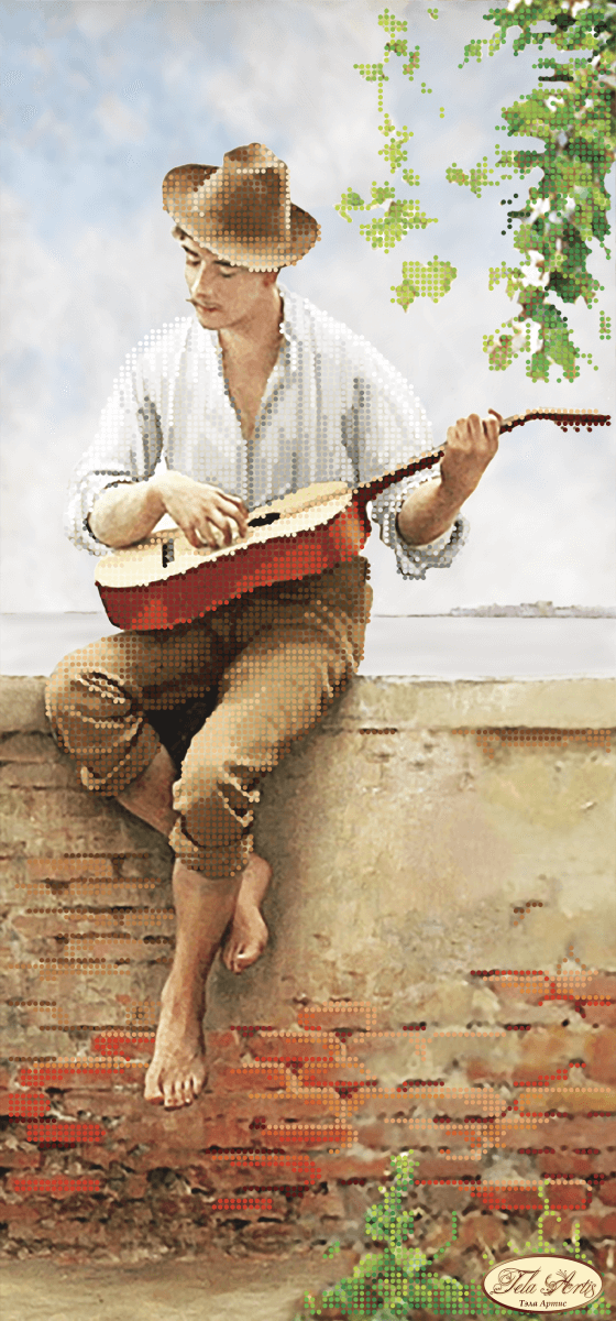 Схема для вышивания бисером Уличный музыкант выполнена на плотном атласе, продублированном флизелином. Края всех схем Тэла Артис запаяны и не сыпятся в процессе вышивания. На схеме указаны количество и рекомендуемые цвета бисера Preciosa.