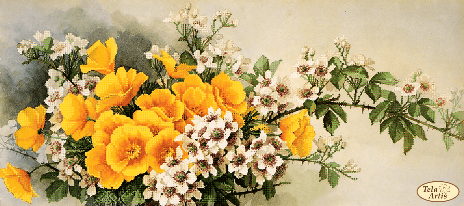 Схема для вышивки бисером Эшольция и хризантемы выполнена на плотном атласе, продублированном флизелином. Края всех схем Тэла Артис запаяны и не сыпятся в процессе вышивания. На схеме указаны количество и рекомендуемые цвета бисера Preciosa.