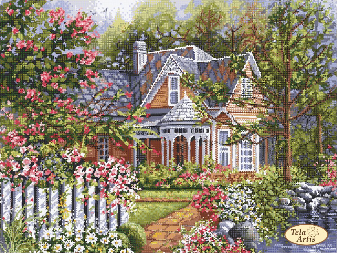 Схема для вышивки бисером с полной зашивкой Домик мечты. Весенний шарм выполнена на плотном атласе, продублированном флизелином. Края всех схем Тэла Артис запаяны и не сыпятся в процессе вышивания. На схеме указаны количество и рекомендуемые цвета бисера Preciosa.